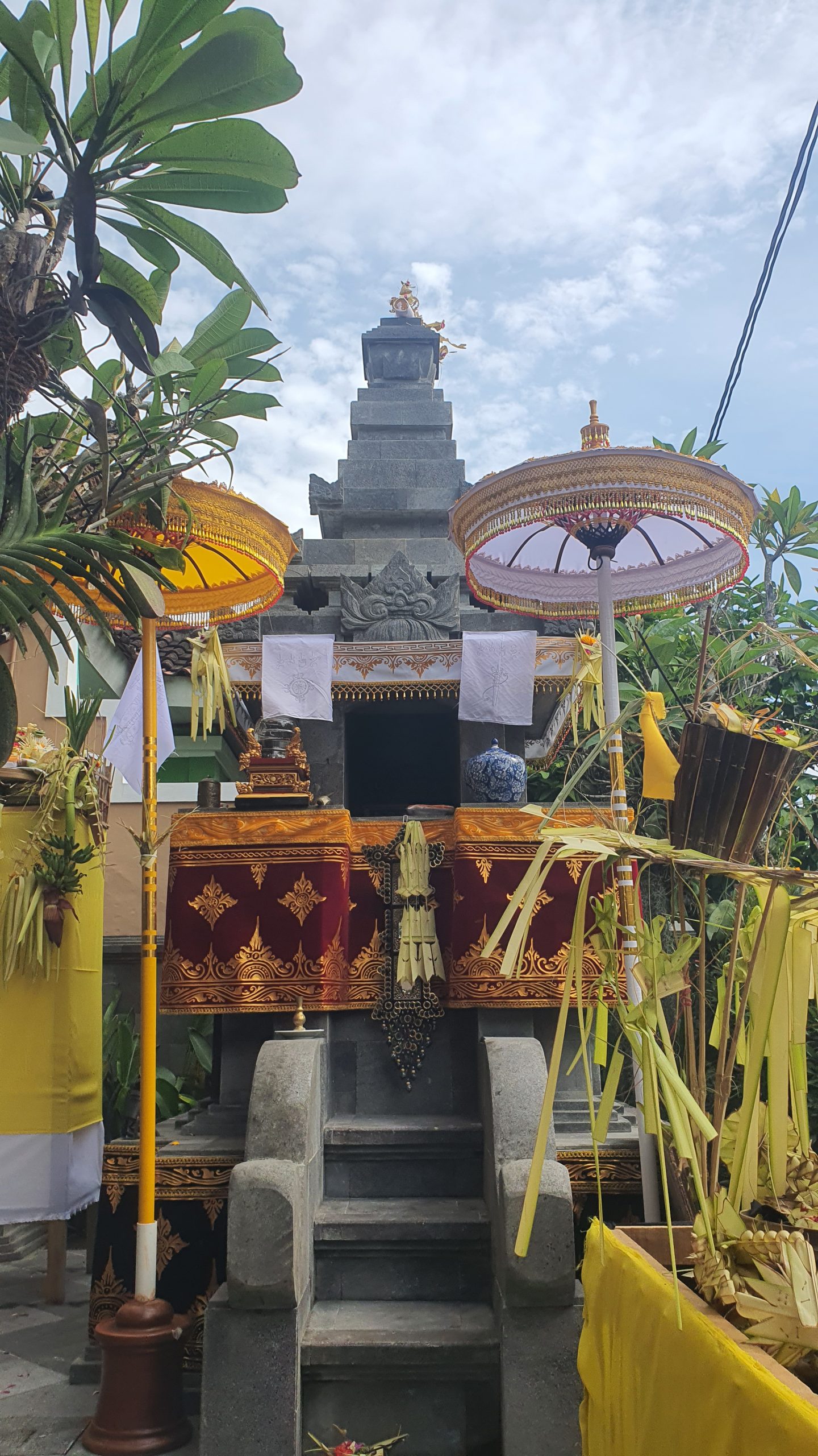- Persembahan Banten – Sesajen berupa bunga, buah, dan jajanan diletakkan di atas buku atau kitab suci.